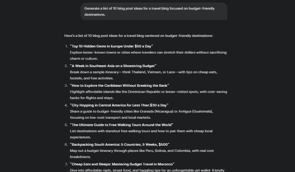 Provide Context: If your request requires specific information, include it in your prompt. For instance, “Generate a list of 10 blog post ideas for a travel blog focused on budget-friendly destinations.”