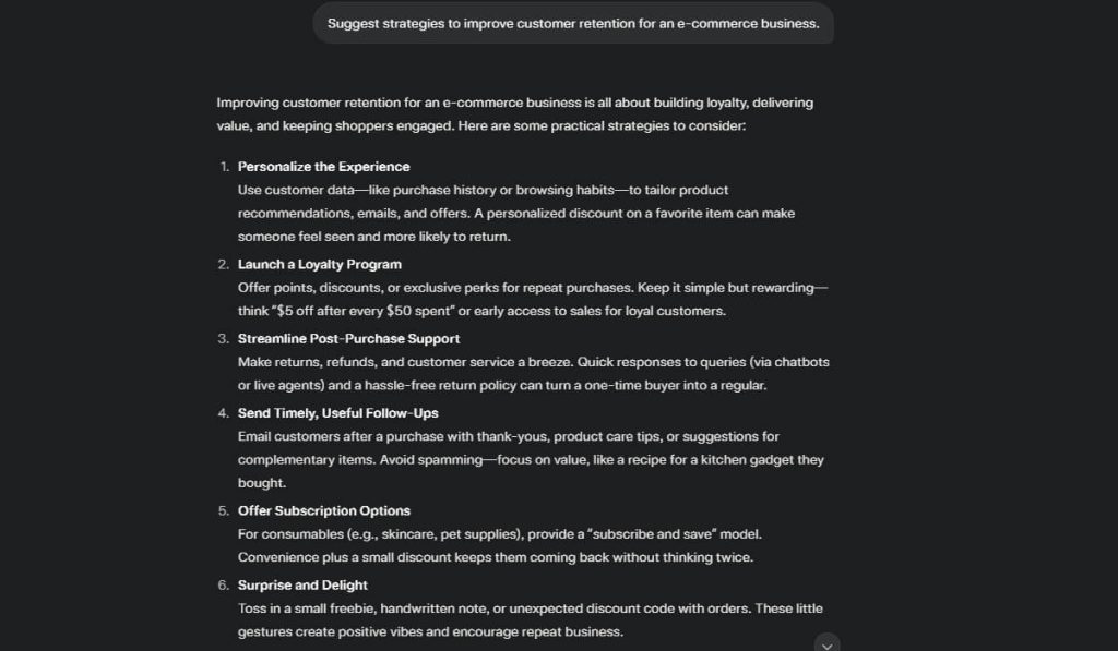 Example Prompt: “Suggest strategies to improve customer retention for an e-commerce business.”